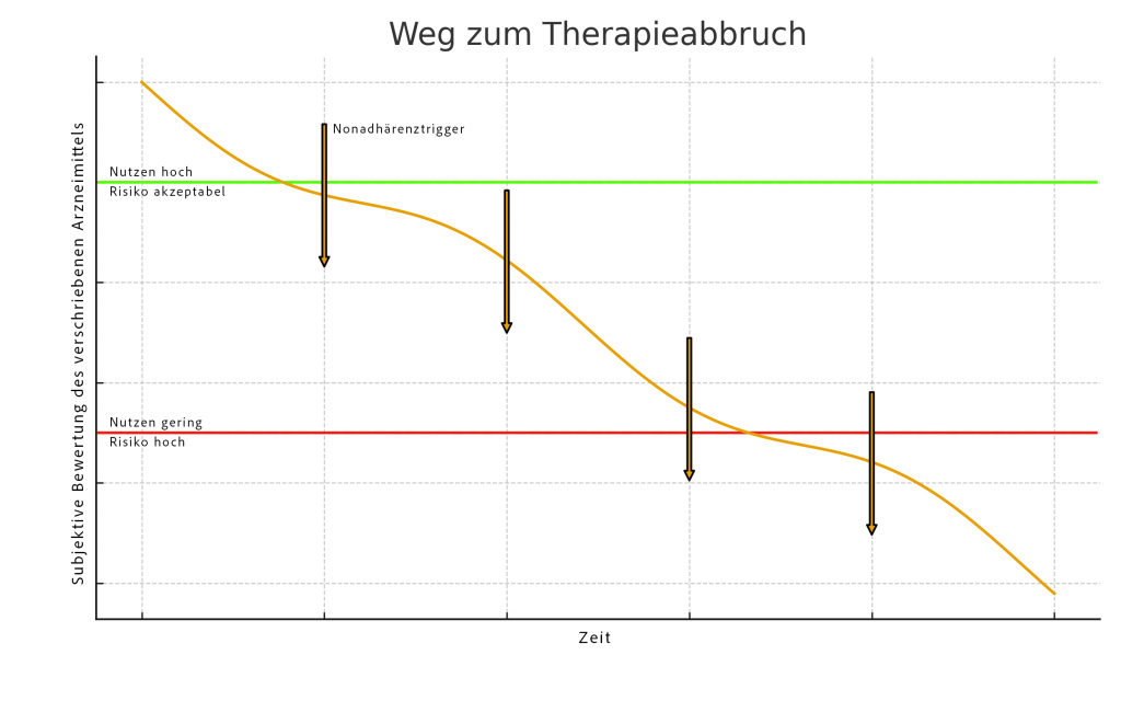 Mit fortschreitender Therapiedauer sinkt bei vielen Patienten der subjektiv empfundene Nutzen des Arzneimittels, während Zweifel, Unsicherheiten und Bedenken an Gewicht gewinnen. Die meisten Patienten sprechen darüber nicht. Im Dialog mit Arzt oder Apotheker nicken sie zustimmend – ihr innerer Entscheidungsprozess verläuft jedoch in eine andere Richtung.