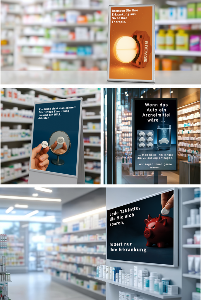 Anstatt eines Vortrags werden Patienten durch eine Posterausstellung mit unseren Denkanstößen geführt. Das Gesamtkonzept umfasst 12 Poster, vier davon zeigt die Abbildung.