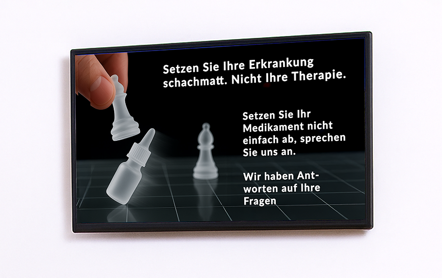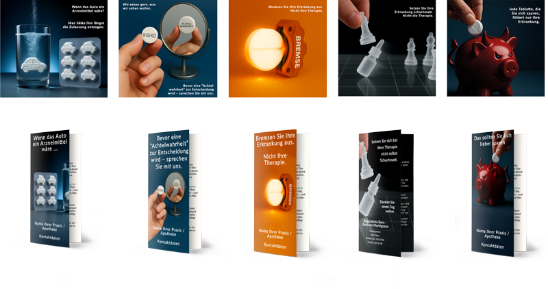 Während die Think Shots als stille Denkanstöße in der Arztpraxis oder Apotheke ihre Wirkung entfalten, sind die Flyer für die gezielte Abgabe an Patienten konzipiert. Arztpraxen überreichen den Flyer gemeinsam mit dem Rezept, Apotheken legen ihn dem abgegebenen Arzneimittel bei. So entsteht Nachhaltigkeit: Die Botschaft wirkt nicht nur im Moment der Begegnung, sondern begleitet den Patienten auch danach.