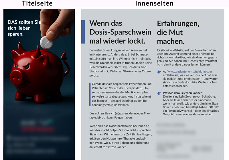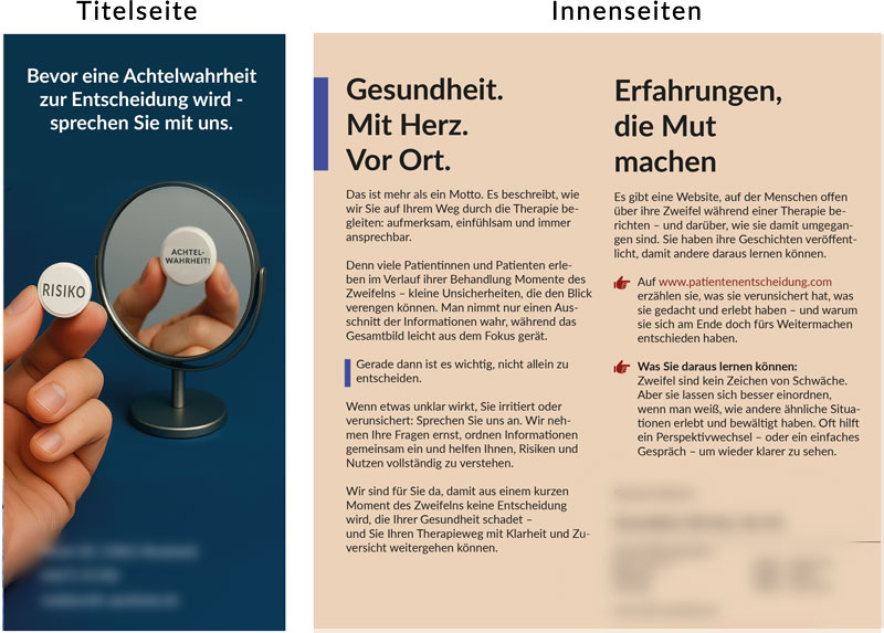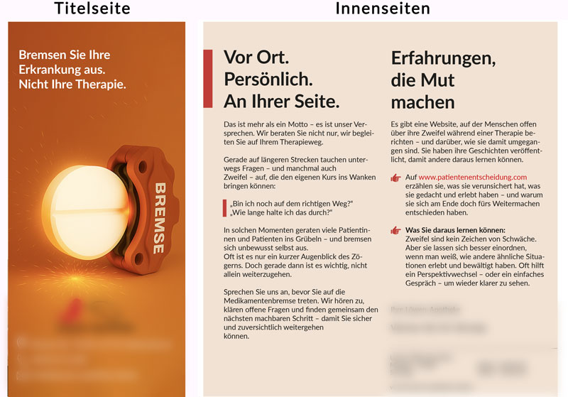Die rechte Innenseite gibt Zuversicht: Sie verweist auf die Website www.patientenentscheidung.com, auf der Patient:innen offen über Zweifel, Rückschläge und ihren Umgang damit berichten. Ihre Geschichten machen Mut, die eigene Therapie fortzusetzen, und helfen, emotionale Barrieren zu überwinden.