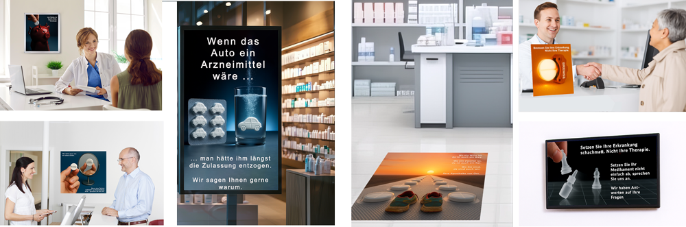 Ein Think Shot wirkt in dem Moment, wo ein Patient ihn sieht. Unsere Think Shots für Apotheken und Arztpraxen in verschiedenen Varianten zur Verfügung. Die Abbildung zeigt, einige Anwendungsbeispiele in digitaler Form, als Bodenkleber als Aufsteller für den Desk oder als Poster.