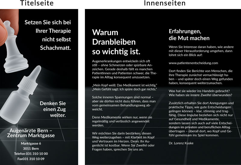 Neben den oben beschriebenen Flyern und Motiven bieten wir auch indikationsspezifische Motive und Flyer an. Hier der Flyer, den Dr. Kuske seinen Glaukompatienten mit dem Rezept in die Hand drückt. Auch dieser Flyer zielt auf die Gegenwartsfalle ab. Der Aufbau entspricht dem bereits vorgestellten Prinzip. Begleitend dazu zeigt Dr. Kuske das entsprechende Motiv in den Wartebereichen der Praxis in digitaler Form.