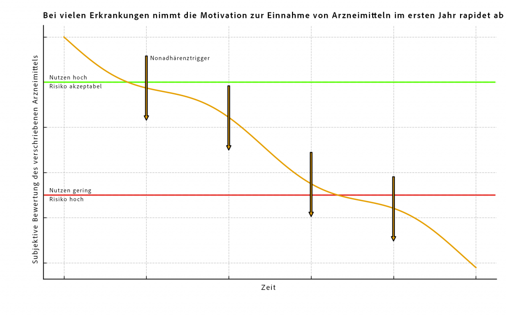 Im weiteren Verlauf der Therapie verändert sich diese Bewertung. Besonders bei chronischen Erkrankungen wie Hypertonie, Diabetes oder Glaukom, die häufig lange symptomlos verlaufen, verliert das Erkrankungsrisiko subjektiv an Bedeutung. Das eigene Gesundheitsgefühl normalisiert sich, während die anfänglich hohe Nutzenwahrnehmung des Medikaments schrittweise abnimmt. Diese Entwicklung lässt sich jedoch – in unterschiedlicher Ausprägung – bei nahezu allen chronischen Erkrankungen beobachten.
